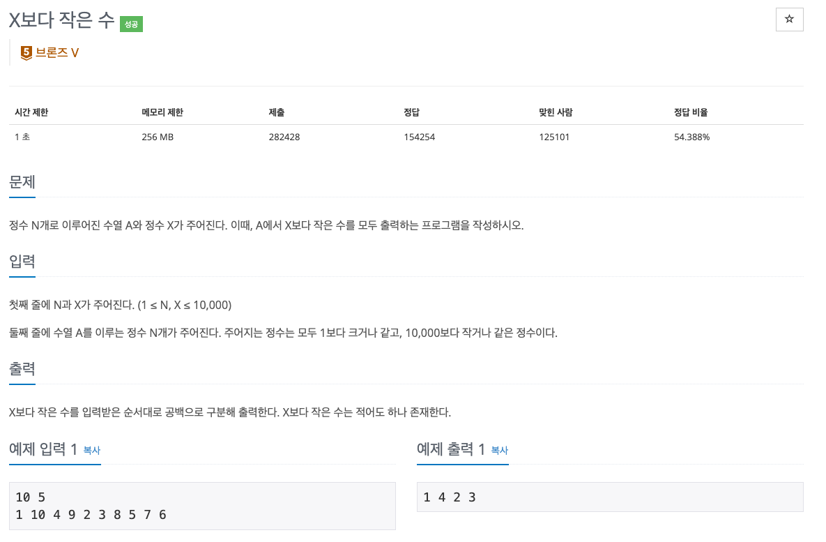 이전 문제인 개수 세기와 매우 유사한 문제이지만 X값과 비교하여 작을 때의 값을 출력하는 문제이다.