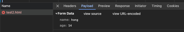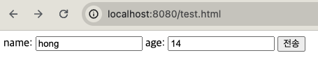 POST방식 중 HTML의 FORM태그로 데이터를 요청할 경우에는 GET방식과 마찬가지로 쿼리 파라미터 형식으로 데이터를 키-값형태로 파싱하지만, GET방식에서는 URL에 데이터를 전달하였다면 POST메서드에서는 메시지 바디에 쿼리 파라미터 형식으로 데이터를 전달하게 된다 따라서 아래와 같이 FORM태그에 데이터를 입력할 경우 name=hong&age=14 형태로 데이터가 message body에 입력되어 서버에게 전달된다.