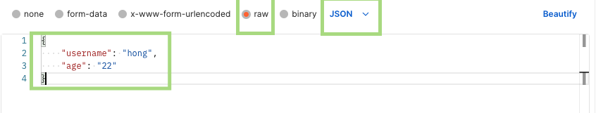 메시지 타입을 raw로 설정하고 JSON으로 변경해준 뒤, 데이터 입력란에 JSON형식으로 원하는 데이터를 입력하여준 뒤 SEND를 통해 데이터를 전송합니다
