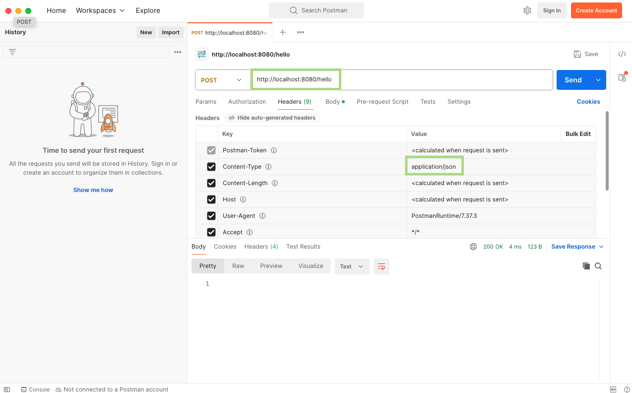 먼저 위의 그림과 같이 URL을 내가 전송하고자하는 URL로 설정하고 method를 POST로 설정해주고 아래의 키값중에서 Content-Type을 application/json으로 설정되었는지 확인합니다