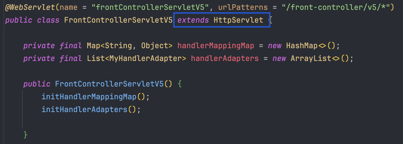 또한 이전에 FrontControllerServlet에서 HttpServlet을 상속하는 것을 아래 코드에서 확인할 수 있는데