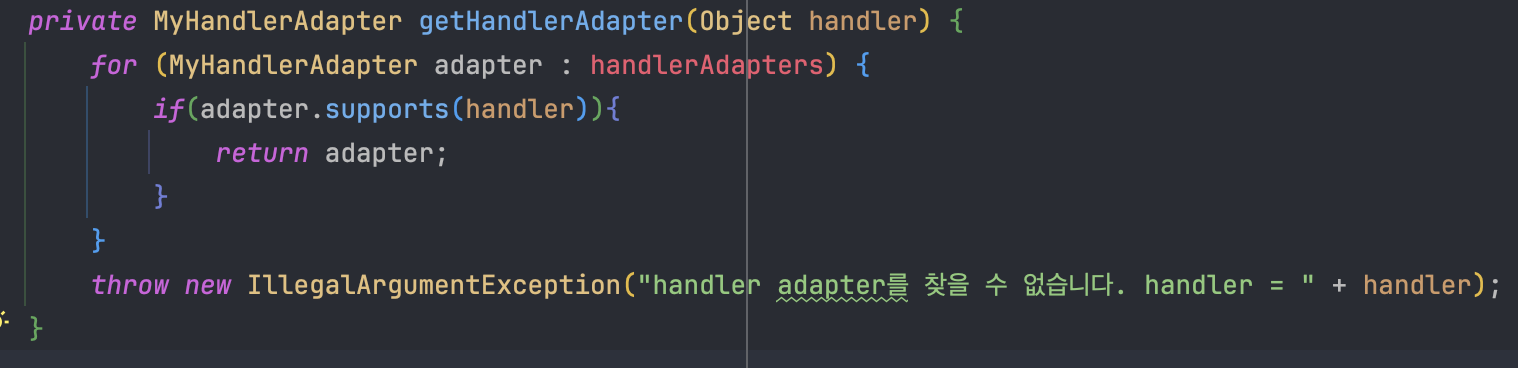 HandlerAdapter또한 마찬가지로 handlerAdapters라는 List컬렉션을 순회하며 파라미터로 받은 handler에 맞는 어댑터를 지원하는지를 supports()메서드를 통해 확인하고 만약 지원하지 않는다면 ServletException예외처리 한다는 것을 확인할 수 있다.