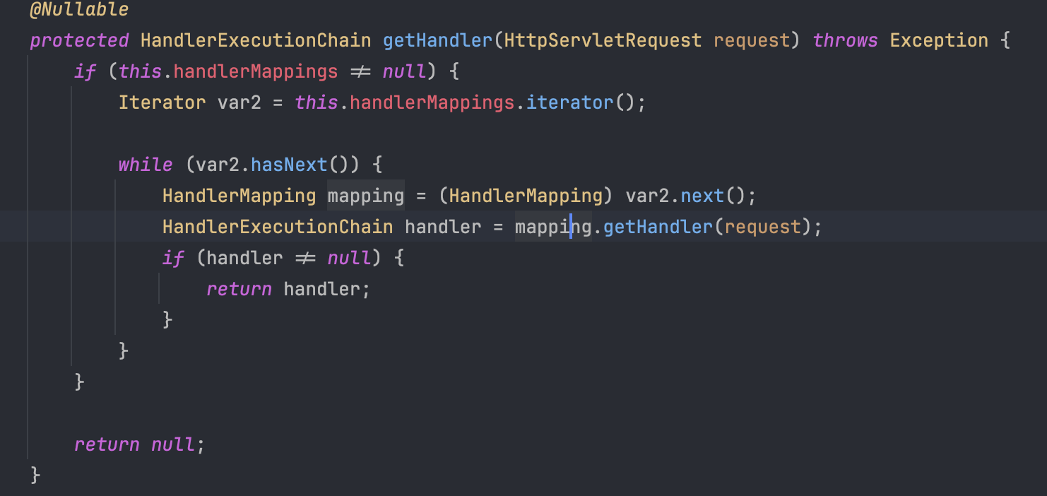 List컬렉션인 handlerMappings변수를 순회하면서 핸들러 매핑정보를 조회하고 없을 경우에는 예외처리 시킨다는 것을 알 수 있다.