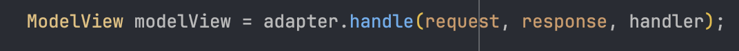 매핑된 핸들러를 handle메서드를 통해 실행하고 ModelAndView타입으로 반환 받는다.