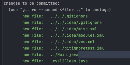 그럼 위와 같은 결과를 얻게되는데 분명 level2패키지를 트랙킹하지 않도록 설정했지만 Test3.java파일은 git에 의해 트랙킹되고 있는 것을 확인할 수 있습니다
