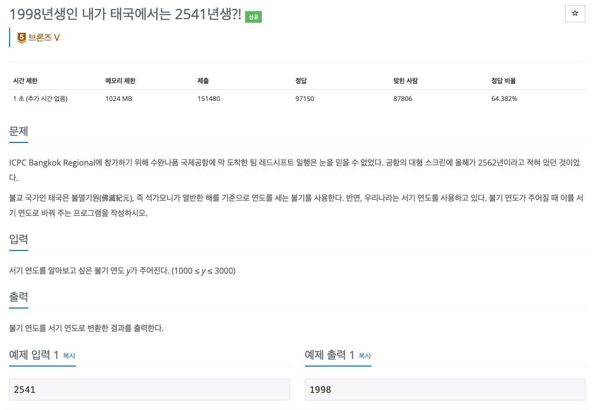 태국의 불기를 우리나라에서 사용하는 서기 연도로 변환하는 프로그램을 작성하는 문제이다.