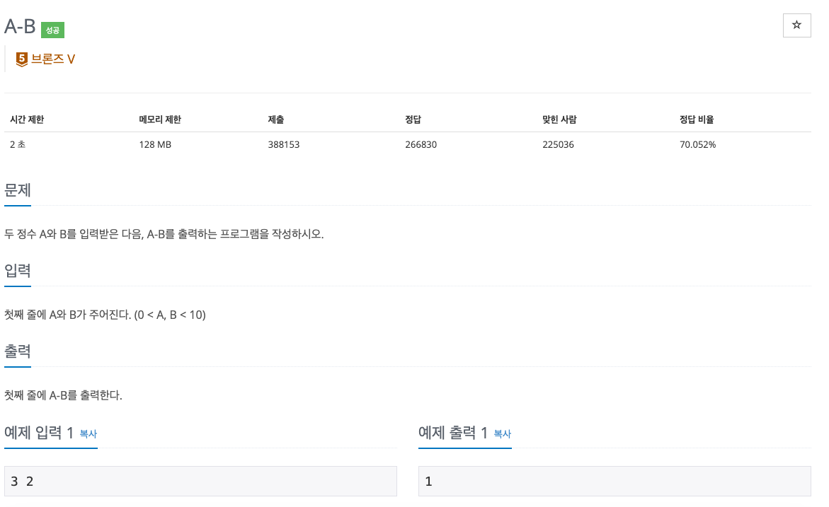 1000번 문제였던 A + B에서 덧셈연산자를 뺄셈연산자로 변환해주면되는 문제이다.
