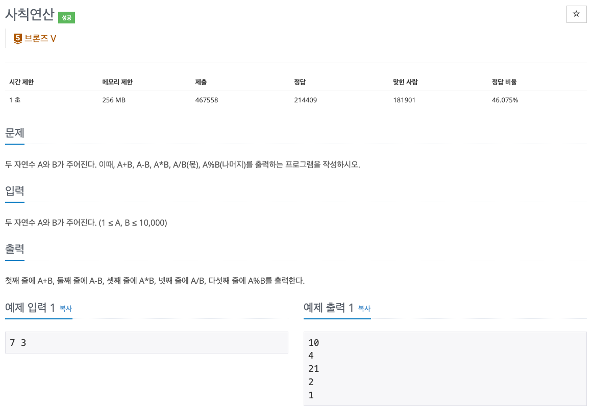 ![[백준] 10869 - 사칙연산](https://img1.daumcdn.net/thumb/R750x0/?scode=mtistory2&fname=https%3A%2F%2Fblog.kakaocdn.net%2Fdna%2FcPlKZj%2Fbtsycvf5W7j%2FAAAAAAAAAAAAAAAAAAAAANQeGOQD4abAgtSybD5AqrY4PlbDTPsaiUBgvh4T1eGI%2Fimg.png%3Fcredential%3DyqXZFxpELC7KVnFOS48ylbz2pIh7yKj8%26expires%3D1761922799%26allow_ip%3D%26allow_referer%3D%26signature%3D%252BXtFHc%252F6%252FTJ9MjyotkvpfHKLi74%253D)