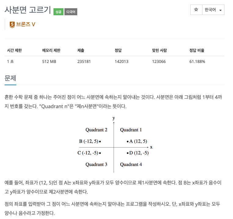 즉, 입력받은 x,y값을 각각 음수인지 양수인지 구분한뒤, 그에 맞는 사분면번호를 출력해주는 프로그램이다.