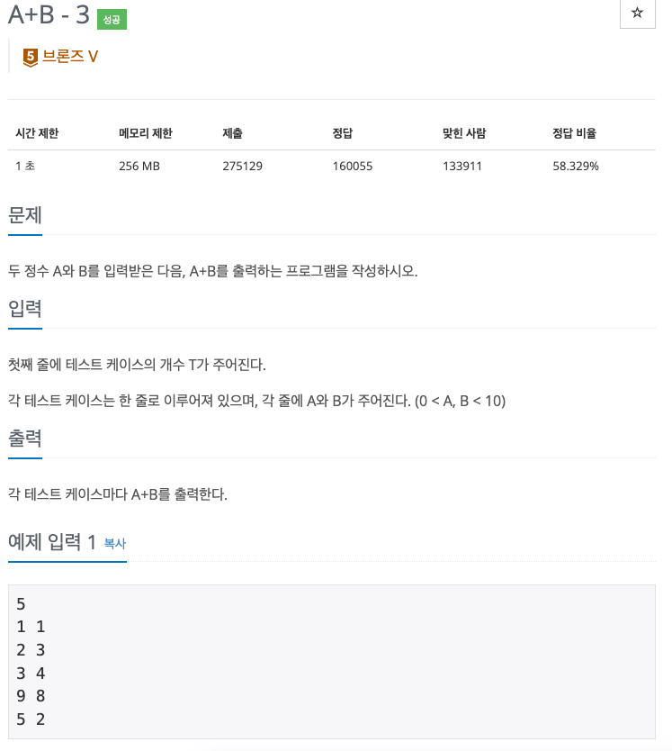 테스트 케이스 T를 받아 T의 값만큼 A+B의 값은 반복출력하는 문제이다.