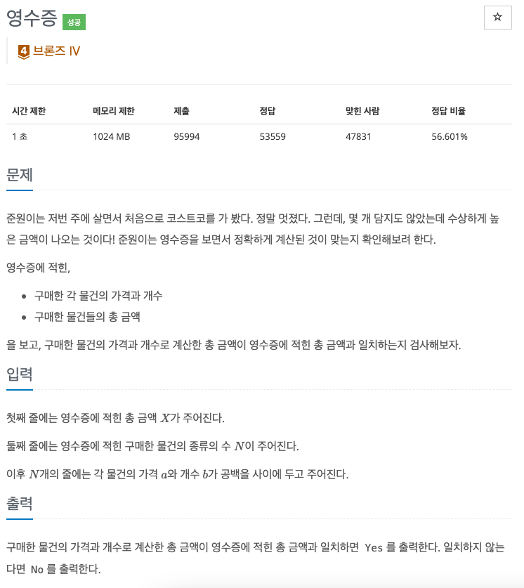 ![[백준] 25304 - 영수증](https://img1.daumcdn.net/thumb/R750x0/?scode=mtistory2&fname=https%3A%2F%2Fblog.kakaocdn.net%2Fdna%2FcpiqhN%2FbtsyHYgjssT%2FAAAAAAAAAAAAAAAAAAAAADYadnguRzKtgc9uPTA4H6FAE6rZqI6CCoGd-BnAvof_%2Fimg.png%3Fcredential%3DyqXZFxpELC7KVnFOS48ylbz2pIh7yKj8%26expires%3D1761922799%26allow_ip%3D%26allow_referer%3D%26signature%3DES%252FiQa2jfVrflKfP%252FOk0Ff%252FHZQU%253D)